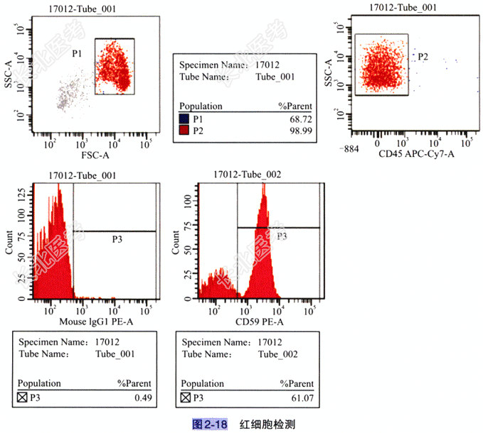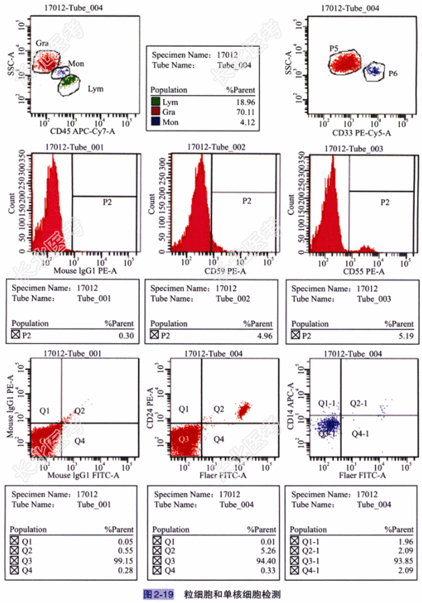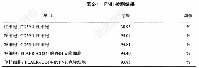 - [材料题] 患者,男,63岁。因“间断排酱油色尿,伴乏力1年”入院。患者1年来反复出现间断酱油色尿,伴全身乏力、四肢酸痛,于外院治疗,具体治疗不详,半个月前上述症状再发加重,故就诊于我院。体格检查 无畏寒、发热,无皮肤、牙龈出血,无恶心、呕吐,无尿频、尿急,无腹痛、黄疸,心、肺、肝、脾检查未见异常。辅助检查:(1)常规检查:血常规WBC1.92×10⁹/L,中性粒细胞百分比37.0%,淋巴细胞百分比55.0%,单核细胞百分比8.0%,RBC2.09×10¹²/L,Hb70.0g/L,PLT207×10⁹/L。(2)细胞形态学检查:①血象结果:白细胞数量减少,分类中性粒细胞比例减低,淋巴细胞比例增高(图2-16)。②骨髓象结果:红系增生旺盛,以中、晚幼红细胞为主,可见双核红细胞、炭核红细胞,成熟红细胞可见大小不均,粒系、巨核系增生较差,少量细胞可见形态改变,能否考虑PNH请结合临床,建议做流式细胞学PNH检测明确诊断(图2-17)。③流式细胞学PNH检测结果:见图2-18、图2-19及表2-1。(3)临床诊断:阵发性睡眠性血红蛋白尿(PNH)。