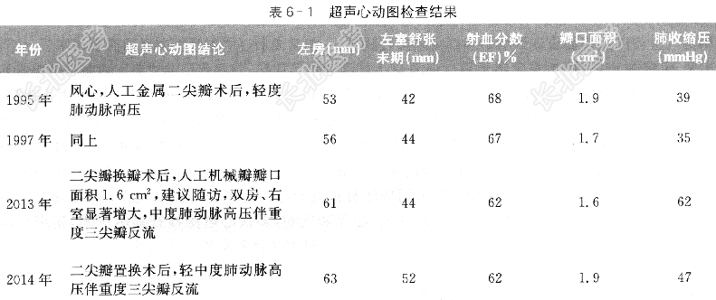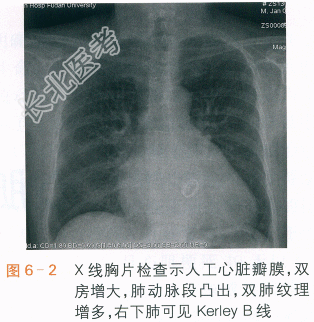 血常规,尿常规及便常规检查正常,粪隐血阴性,TB70.8μmol/L,DB22.3μmol/L,TP73g/L,ALB46g/L,ALT7IU/L,AST20IU/L,ALP129IU/L,γ-GT365IU/L,肾功能正常,血电解质在正常范围。甲状腺功能正常,NT-proBNP2762pg/ml,cTnT0.017ng/ml。INR2.16,APTT39s。心电图检查示房颤,心室率75次/min,右室增大(见图6-1);2014年10月X线胸片检查示人工心脏瓣膜,双房增大,肺动脉段凸出,双肺纹理增多,右下肺可见Kerley B线(见图6-2)。发病以来超声心动图检查结果如表6-1所示。
