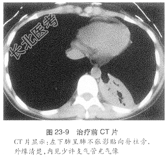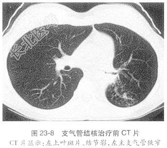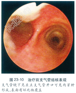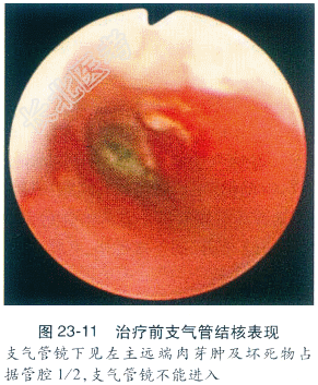 - [材料题] 患者,女性,21岁,主因“刺激性干咳2年,加重1个月”入我院。患者于2年前无明显诱因出现刺激性咳嗽,以干咳为主,偶有黄痰,诊断为“上呼吸道感染”,经抗感染治疗后咳痰好转,但仍有咳嗽。2年来反复多次出现咳嗽、咳痰加重,均经抗感染治疗后好转。入院前1个月前受凉后咳嗽加重,伴咳白痰,伴发热,体温37.5~38℃,以午后为著,经抗感染治疗后无好转,为进一步诊断治疗收入我院。入院后查胸部CT示纵隔及心脏轻度左移,右肺上叶尖后段及左上肺可见多发斑片、结节影,可见“树芽征”改变,左下肺呈肺不张影贴向脊柱旁,外缘清楚,内见少许支气管气像,左主气管及左侧各叶支气管狭窄。纵隔未见肿大的淋巴结。心脏、大血管未见异常。左侧胸腔少量积液。气管镜示气管下端左侧壁、左总、右上可见肉芽肿,表面坏死;左总远端肉芽肿表面坏死,坏死占据管腔1/2,支气管镜不能进入检查(图23-8~图23-11)。其他辅助检查:血抗结核抗体(Lam-Ab)阳性,血沉:94mm/h,痰抗酸杆菌2+,结核分枝杆菌快速培养阳性。