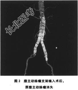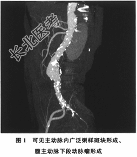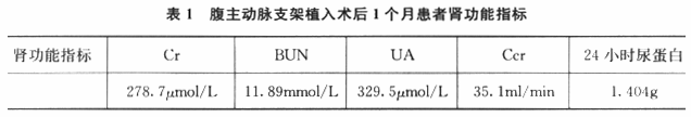 - [材料题] 患者男性,67岁,因“发现血压升高二十余年,波动2个月”入院。患者二十余年前始发现血压升高,诊断为高血压病,给予降压治疗。2008年因胸腹部疼痛行CTA检查示主动脉内广泛粥样斑块形成,内膜血肿,腹主动脉下段动脉瘤形成(图1),介入科会诊认为未见破口,未予行介入手术。2010年2月复查多排CTA示腹主动脉瘤伴附壁血栓,胸腹主动脉及双侧髂动脉粥样硬化伴动脉内膜局部溃疡形成。血管外科认为腹主动脉瘤直径达5.2cm,有破裂风险,具备手术指征。于2010年2月2日行腹主动脉瘤腔内支架型人工血管植入术(图2)。支架术后1个月出现血肌酐进行性升高,肌酐清除率(Ccr)明显下降,24小时尿蛋白逐渐升高,血压波动,最高达180/100mmHg而收住入院(表1)。