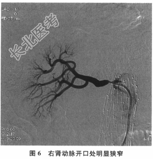 - 简答题4、[提示]复查肾脏B超示右肾较左肾偏小,右肾血管树显示欠清,考虑为肾主动脉硬化(右侧明显)。行肾动脉造影示右肾动脉起始处明显狭窄,狭窄率为85%~90%,左肾动脉未见明显狭窄(图6):