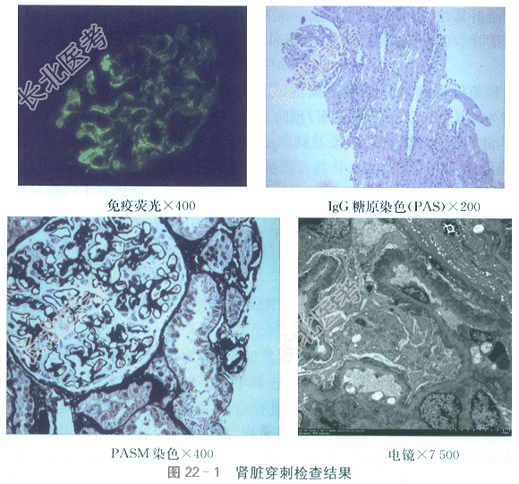 (5)肾脏穿刺检查。免疫荧光:IgG2+呈细颗粒状,沿毛细血管袢沉积。光学显微镜(光镜):镜下其见28个肾小球,其中1个小球呈球性硬化,余小球毛细血管袢均匀一致增厚,过碘酸六胺银染色(PASM)下上皮侧可见空泡状结构和钉突,各小球节段性系膜基质及系膜细胞轻度增生,小管间质大致正常,小叶间动脉节段性硬化,可符合膜性肾病Ⅱ期。电子显微镜(电镜):足突广泛融合,基膜弥漫性增厚,上皮下可见大量电子致密物沉积,刺激基膜增生形成钉突,系膜基质轻度增多,系膜区未见电子致密物沉积(见图22-1)。