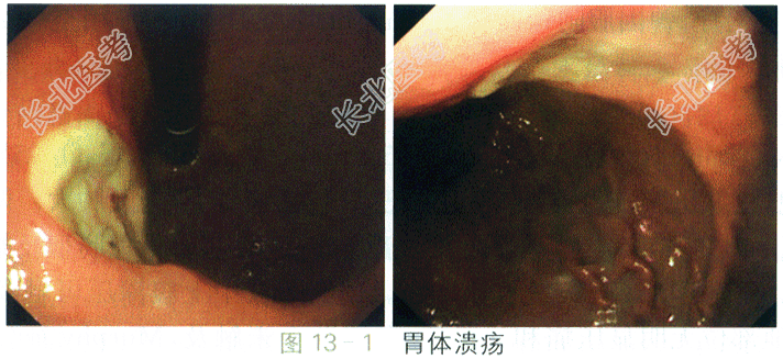 (5)胃镜检查:胃体上段小弯偏前壁见深凹溃疡,约2×2cm,边缘隆起,明显充血水肿,边界尚规则,溃疡底覆厚白苔,未见活动性出血(见图13-1)。胃窦及胃体小弯侧黏膜红白相间,以白为主,血管显露。食管、贲门、胃底及十二指肠球部及降部上段未见异常。