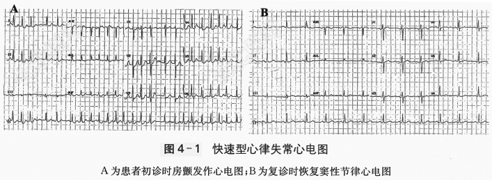 - [材料题] 患者,女性,59岁,因“反复胸闷、心悸2年,加重1个月”入院。患者近2年来无明显诱因出现胸闷、心悸,呈间歇性,每次发作时自觉脉率不齐,无胸痛,无黑矇、晕厥、意识丧失等,外院心电图检查示“心房颤动”,予阿司匹林0.1gqd、盐酸普罗帕酮100mg tid治疗,诉效果不佳。近1个月来患者自觉发作较前频繁,每次发作持续时间不等,短则数小时,长则3~4天。于我院门诊就诊,听诊第一心音强弱不等,HR140次/min,心律绝对不齐,脉搏短绌。心电图检查提示:心房颤动伴快速心室率,HR140次/min(见图4-1A);经胸超声心动图检查未见明显异常。停用阿司匹林,改华法林2.5mgqd口服抗凝,并嘱每周监测凝血酶原时间国际标准化比值(INR);停用盐酸普罗帕酮,予美托洛尔25mgbid口服控制心室率。10天后门诊复诊,查INR2.20,心电图检查示:窦性心律,HR74次/min(见图4-1B)。继续予华法林和美托洛尔治疗3周后,收入院。有高血压病史6年,最高血压达160mmHg/100mmHg,现服用氨氯地平片5mgqd,血压控制可。2型糖尿病病史5年,口服阿卡波糖(拜糖平)50mg tid,血糖控制平稳。无冠心病、风湿性心脏病、甲状腺功能亢进等疾病史,无脑梗死病史。体格检查:T37.0℃,P70次/min,R20次/min,BP136mmHg/76mmHg。神志清,一般可,皮肤黏膜无出血点,甲状腺未及肿大。双肺呼吸音清,未及明显干湿啰音。心界不大,HR70次/min,律齐,未及明显杂音。腹软,无压痛,肝脾肋下未及,双下肢无水肿。实验室和影像学检查:血、尿、粪常规检查均正常;ALT12IU/L,AST 17IU/L,Scr81μmol/L,K⁺3.9mmol/L,葡萄糖5.8mmol/L;C5.06mmol/L,TG1.51mmol/L,HDL-C1.34mmol/L,LDL-C3.03mmol/L;cTnT0.02ng/ml,NT-proBNP98.0pg/ml;甲状腺功能正常;INR2.06,APTT46.5s,D-二聚体0.78mg/L。入院心电图检查:窦性心律。X线胸片检查:右下肺少许陈旧灶。经胸超声心动图检查未见异常,左房内径41mm,左心室射血分数(LVEF)67%。经食管超声心动图检查未见附壁血栓。