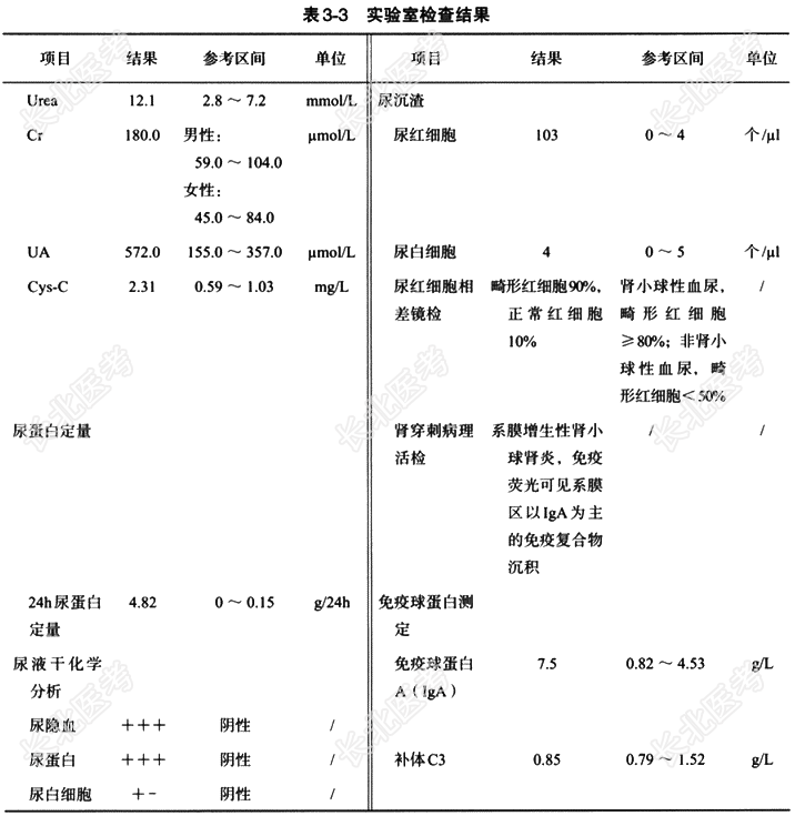 - [材料题] 患者,男,32岁。主因“泡沫尿3⁺年,发现肾功能损害”入院。3年前患者于当地医院体检时发现尿蛋白高于正常参考区间,肾功能未发现明显异常,伴泡沫尿,无肉眼血尿及尿量异常,无腰痛、尿频、尿急、尿痛等不适,以“尿蛋白原因待查”对症治疗,症状缓解后出院。期间多次复查尿常规提示尿蛋白弱阳性,未予以重视。今患者因尿常规和肾功能异常就诊,门诊以“尿蛋白原因待查”收入院。患者患病以来精神、睡眠尚可,饮食缺乏,粪便正常,余无特殊表现。既往患有急性阑尾炎、丙型病毒性肝炎,已对症治疗处理。无其他传染病及慢性疾病、家族病病史,无药物过敏史。体格检查 T36.5℃,P73次/分,R20次/分,BP142/95mmHg。发育正常,神志清楚,慢性病容,颜面部轻度水肿;颈部、胸部检查无异常;腹部有急性阑尾炎术后瘢痕,无压痛、反跳痛及肌紧张;余部位检查无特殊表现。实验室检查 见表3-3。