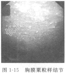 患者男性,因低热、盗汗伴咳嗽、咯血1个月入院。入院后查相关肿瘤标志物阴性,气管镜刷检物抗酸染色阴性,血沉70mm/h;胸水呈渗出性,血清腺苷脱氨酶(ADA)55U/L;胸腔镜下可见胸膜表面充血明显,满肺粟粒样结节(图1-15),活检物行病理学检查可见慢性肉芽肿伴坏死(图1-16)。
