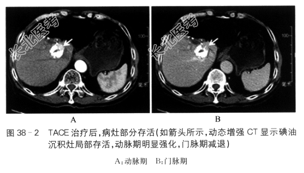 2014年11月3日腹部增强CT示肝癌介入治疗后改变,病灶部分存活。