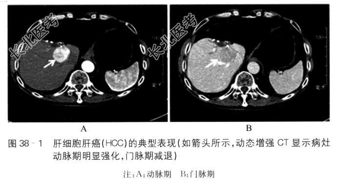 2010年8月患者体检发现AFP51.5ng/ml,当时无不适主诉,腹部CT诊断为肝癌,约10cm。2010年9月19日患者在我院行左半肝切除术,术后病理为肝细胞肝癌(HCC)。患者术后AFP下降至正常,此后每2个月门诊随访。2012年5月10日,彩超发现肝内1.8cm复发灶,AFP阴性;患者于2012年5月17日在我院行肝右叶部分切除术,术后病理为HCC。此后,继续每2个月门诊随访。2013年7月,彩超检查再次发现肝内约1.8cm复发灶,AFP阴性;患者在门诊接受6次无水酒精注射治疗。治疗1个月后,增强MRI提示肝内病灶坏死。2014年9月,患者彩超检查发现肝内约3.5cm复发灶,增强腹部CT确认肝内复发(见图38-1);AFP阴性。患者于2014年9月22日在我院行经导管动脉化学栓塞(TACE)治疗,术中肝动脉造影发现肝右叶一个约3.5cm肿瘤血管染色灶,经微导管超选至肝右动脉,给予表柔比星30mg与超液化碘油6ml制成混悬液栓塞,见病灶碘油沉积好。2014年11月3日在我院CT检查提示右叶病灶碘油沉积,局部存活(见图38-2)。此次为行肝癌射频消融治疗收治入院。整个病程中,患者无不适主诉,无黄疸、发热、腹胀、呕血、黑便,精神可,饮食、睡眠佳。
