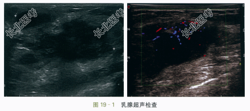 (2)乳腺B超检查结果(图19-1)提示:左侧乳腺可见一大小约49.3mm×27.9mm×43.1mm团块,位于3~4点钟方向,水平位生长,呈不规则形,边界清晰,边缘微小分叶,内部呈低回声,分布不均,部分向皮下延伸,内可见小片无回声区,后方回声无明显改变,CDFI示内边缘及中央区见较丰富血流信号,血管较细,走行规则。双侧腋窝及锁骨上未见明显异常肿大淋巴结。诊断意见:左侧乳腺实质性团块,拟BI-RADS-US4B类,考虑乳腺脓肿可能,请结合临床。