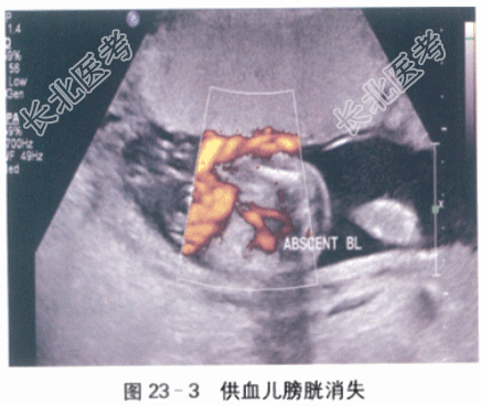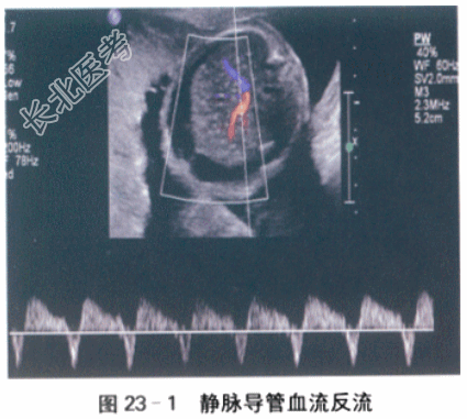 - [材料题] 患者,女性,32岁,已婚,因“G₂P₀,停经22周,腹胀一周”入院。初潮15岁,月经5天/30天,无痛经。末次月经2021-4-13。停经35天查尿HCG(+),孕产期2022-1-20。停经10周当地医院超声提示双胎妊娠。唐氏筛查未做。在当地医院每月做一次超声。于1月前(孕18周)在当地医院行超声检查未提示异常。近一周,自觉腹胀严重,平卧睡后有胸闷不适主诉。随即到当地妇幼保健院行超声检查:宫内两个胎儿,羊水多,羊水指数360mm。当地医院拟诊“孕22周,双胎妊娠,羊水过多”,建议转至上级医院诊治。既往体健,除人工流产外,无其他手术和外伤史,家族无遗传病及肿瘤病史,无双胎家族史。0-0-1-0,3年前自然流产一次。体格检查:Wt72kg,Ht159cm,BP130mmHg/80mmHg,HR100次/min,一般情况良好,内科检查无异常,全身浅表淋巴结未及肿大,腹隆,无压痛,下肢水肿(++)。腹部张力高,可见腹壁浅静脉怒张。产科检查:腹围122cm,宫高35cm,胎心140/152次/min,胎位不清。骨盆外测量无异常。实验室和影像学检查:血常规检查:Hb107g/L,RBC4.2×10¹²/L,WBC3.7×10⁹/L,N71%,PLT121×10⁹/L。凝血功能检查:APTT32s,PT12s。肝肾功能检查:AST23μmol/L,ALT35μmol/L,TP60g/L,Alb31g/L,TB10μmol/L,BUN5.6mmol/L,Cr90μmol/L。肝炎指标及HIV,RPR:均阴性。超声检查:2021-7-8外院B超图片提示一个孕囊,两个胚芽。入院后B超检查:胎盘后壁。宫内可见两个胎儿,大胎儿体重位于该孕周第52百分位,羊水深度18.3cm,心胸比增大(59%),静脉导管血流A波反流(见图23-1),脐血流舒张期倒置,大胎儿出现水肿和腹腔积液(见图23-2)。小胎儿体重位于该孕周第9百分位,羊水过少(深度0.9cm),呈包裹趋势,膀胱消失(见图23-3)。脐血流、大脑中动脉血流、静脉导管多普勒血流无异常。两胎儿体重相差26%。宫颈长度37mm。