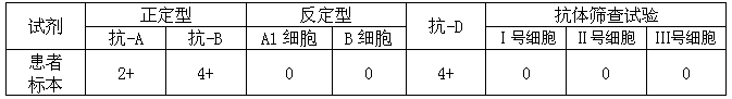 - [材料题] 患者,男性,79岁,患外套细胞淋巴瘤第Ⅳ期,无输血史,因继发性贫血而就诊。血液常规检查:Hb 70g/L,HCT 0.23。医生申请输注RBC,血库对患者标本进行常规血型鉴定(试管法)和抗体筛选试验(抗人球蛋白法),结果见下表:
