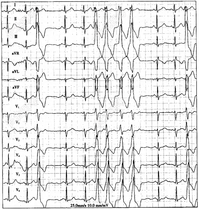 - 简答题1、图中短阵宽QRS波心动过速应诊断为?