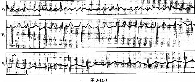 - [材料题] 患者女性,45岁,风湿性心脏病。心电图如图3-11-1所示,