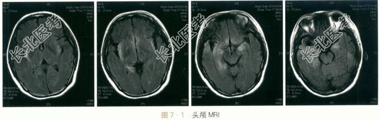 - [材料题] 患者,女性,27岁,因“发热、头痛伴精神行为异常半月余”入院。患者半月前无明显诱因下出现发热,体温最高至40℃,同时伴有头痛,以前额部持续性胀痛为主,偶有恶心呕吐,但无咳嗽咳痰、腹痛腹泻。至当地医院门诊以抗生素治疗无好转,并出现胡言乱语、烦躁不安,伴有记忆力减退及定时定向障碍,症状逐渐加重。行腰穿脑脊液中WBC160×10⁶/L,其中M074%;蛋白822mg/L,葡萄糖4.0mmol/L,氯化物122mmol/L;头颅MRI检查提示额叶、颞叶多发病灶伴有增强。予抗病毒及对症支持等治疗,患者无明显好转。1周后复查腰穿,脑脊液WBC165×10⁶/L,M055%;蛋白1008mg/L,葡萄糖2.3mmol/L,氯化物131mmol/L。为进一步诊治收住入院。自患病以来,患者胃纳可,睡眠差,大小便正常,无体重明显下降。既往史:否认肝炎结核史;否认手术外伤史;否认输血史;否认食物、药物过敏史。各系统回顾无特殊。体格检查:(1)内科检查:T37.6℃,P82次/min,BP126mmHg/81mmHg,R16次/min。双肺呼吸音清,心律齐。腹软,肠鸣音正常;肝脾无肿大。(2)神经系统检查:神清呆滞,反应迟钝,查体不合作。对答部分切题,偶有胡言乱语,定时定向差,近时记忆力减退,计算不能。颅神经:双侧瞳孔直径3mm,等大等圆,对光反射良好;眼球各方向运动正常;双侧额纹对称,双侧鼻唇沟对称,口角不偏。双侧软腭上抬可,腭垂不偏,咽反射正常。伸舌居中,无舌肌萎缩及舌肌纤颤。运动系统:四肢肌力检查不配合,四肢可见自主活动,肌张力无增减,肱二头肌反射、肱三头肌反射、桡骨膜反射、膝反射、踝反射均双侧对称(++)。双侧巴彬斯基征、戈登征(-),脑膜刺激征(-)。感觉系统及共济功能:四肢针刺觉、轻触觉、深感觉均对称正常;复合感觉检查不配合;患者共济检查不配合。脑膜刺激征:无颈抵抗;克匿征(-)。血常规:RBC4.12×10¹²/L,WBC13.5×10⁹/L,N85%;FBG4.5mmol/L。肝功能:ALT25IU/L,AST23IU/L,γ-GT27IU/L,AKP80IU/L;TB14lumol/L,DB5.3μmol/L,TP65g/L,ALB40g/L。肾功能:BUN4.4mmol/L,Cr52μmol/L。脑脊液常规:无色,透明度清,潘氏试验(+++),RBC1×10⁶/L,WBC53×10⁶/L,多核细胞17%,M083%。脑脊液生化:糖2.20mmol/L,氯123mmol/L;蛋白773mg/L;同步血糖5.50mmol/L。血清免疫学:抗核抗体、ENA抗体与ANCA均为阴性。结核试验:T-SPOT(-)。肿瘤标志物全套:均为阴性。血清病毒抗体检测:除单纯疱疹病毒Ⅰ型抗体IgG为阳性,巨细胞病毒抗体IgM、巨细胞病毒抗体IgG、单纯疱疹病毒Ⅰ型抗体IgM、单纯疱疹病毒Ⅱ型抗体IgM、单纯疱疹病毒Ⅱ型抗体IgG、EB病毒衣壳抗原抗体IgG、EB病毒衣壳抗原抗体IgM、EB病毒早期抗原抗体IgM与EB病毒抗原抗体IgG均阴性。心电图检查:窦性心律。肺部CT检查:两肺下叶炎症伴两侧少量胸腔积液;左下肺小结节影;肝门区致密影。脑电图检查:双侧见散在2~3Hzδ波、θ波;未见典型痫样放电。头颅MRI检查:双侧岛叶及右侧颞叶见片状长T₁长T₂信号,flair相呈高信号,弥散相无异常(见图7-1)。脑室系统显示可,中线结构无移位。双侧蝶窦黏膜增厚。