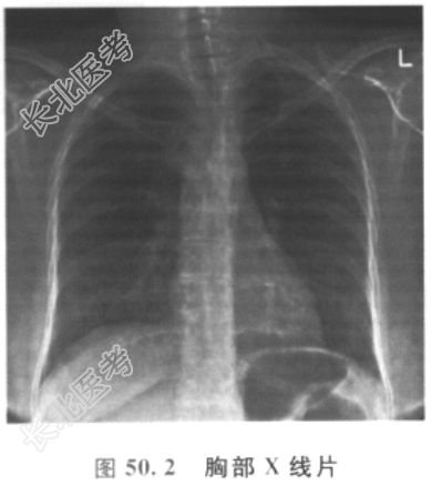 患者女性,29岁,因突发右侧胸痛,伴有气短急诊入院。患者于凌晨3点痛醒。胸痛随深呼吸和咳嗽加重。气短从开始出现到患者急诊就诊持续超过4h以上。伴有轻度干咳。既往有哮喘,使用沙丁胺醇和倍氯米松控制良好,无其他病史。无特殊家族史。患者是一名驾驶教练,3周前从澳大利亚度假3周归来。外出期间无患病。过去4年间服用避孕药。