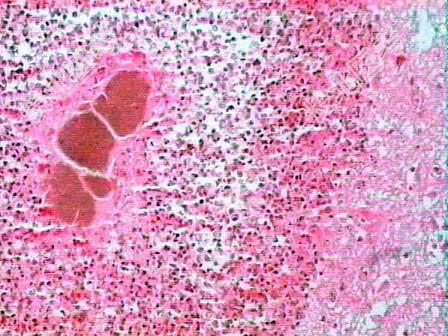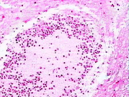 - 单项选择题患者,女, 8岁。因头痛呕吐,高热入院。大体观如图, 镜下可见大量变性坏死中性粒细胞,如图所示。应诊断为 ( )