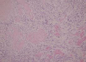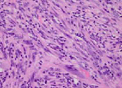 - [材料题] 患者男,4岁,因“腹痛”来诊。剖腹探查:肠系膜上有一肿块,累及小肠。镜下形态如图所示。