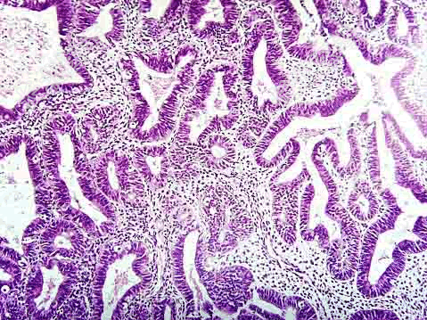 - 单项选择题女性,40岁, 月经量多不规律2月余,诊刮子宫内膜, 显微镜下见腺体增生,与间质比> 3:1, 腺上皮部分出现假复层,核无明显异型(如图), 应诊断为 ( )