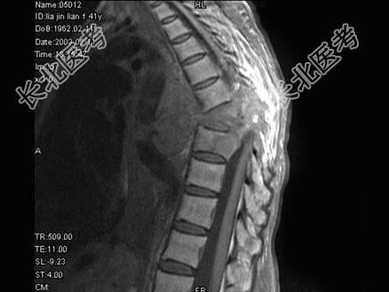 - 单项选择题女,41岁, 胸背部疼痛,肢体活动感觉障碍2年余, MRI检查见T