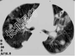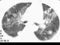 - 单项选择题女,32岁, 鼻梁双颊部出现红斑伴发热咳嗽2周,肘腕关节游走性疼痛, 结合CT图像,最可能的诊断为 ( )