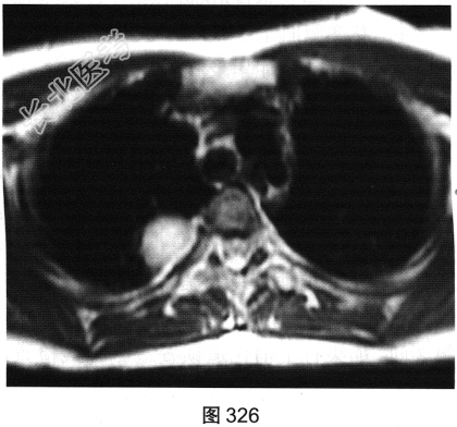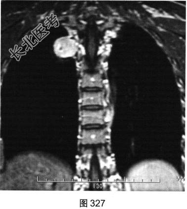 - [材料题] 患者女性,36岁,平素健康,无明显临床症状。单位体检拍摄胸部X线平片提示“右上肺阴影”。遂到大型医院进一步行胸部影像学检查,如图325~图327所示。