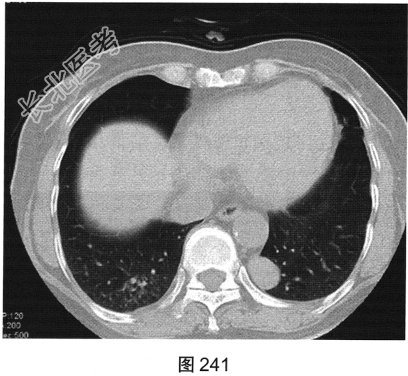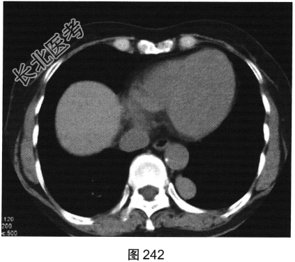- [材料题] 患者女性,25岁。偶有胸闷,进食不畅,无咳嗽、无发热。行胸部CT检查,如图241、图242所示。