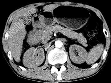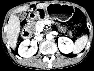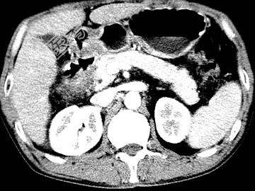 - 单项选择题女,63岁, 右上腹疼痛,呈不规律性钝痛, 伴恶心,时有呕吐, 呕吐物为胃内容物混有胆汁,CT检查如图, 最可能的诊断是 ( )
