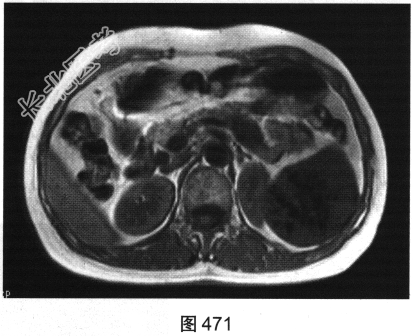 - 多项选择题4.[提示]为进一步明确诊断,患者行MRI检查, 如图470~图473所示。对MRI图像描述正确的是( )