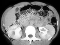 - 静脉肾盂造影立位片,左肾位于盆腔内,可上