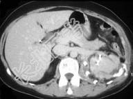- 中年男性,腰部不适, 伴有阵发性腹痛,行