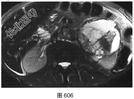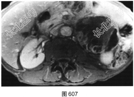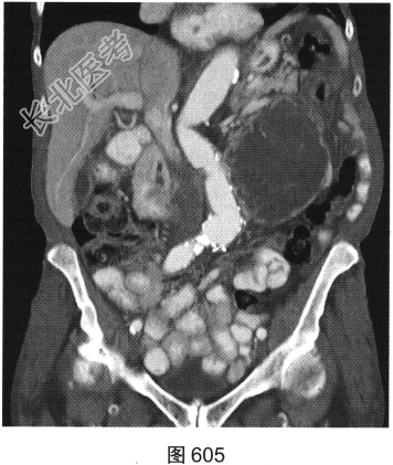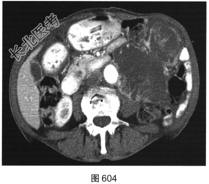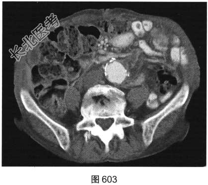 - [材料题] 患者女性,85岁,腹主动脉瘤破裂手术修复后,腹部疼痛。患者行腹部CT检查,见图603~图607。