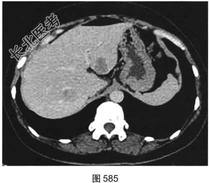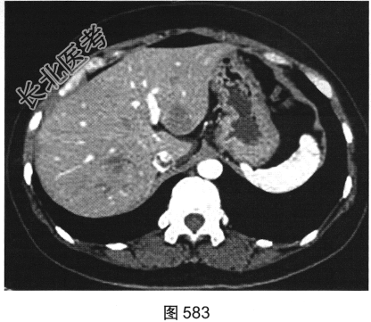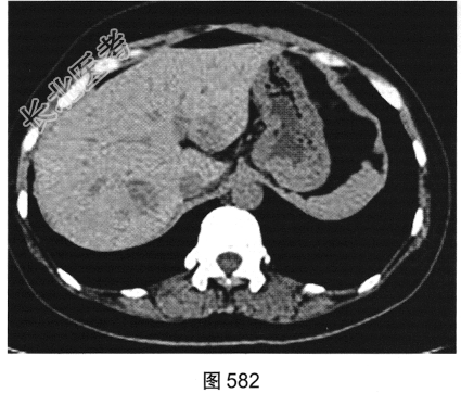 患者女性,38岁,因“间断性下腹部疼痛1周”入院。既往:否认肝炎、结核病史。查体:下腹部压痛。患者行腹部CT检查,见图582~图589。