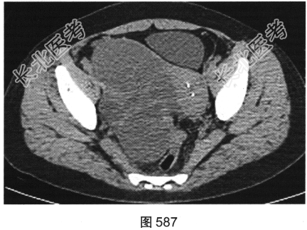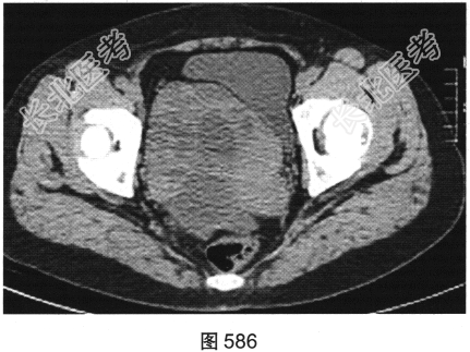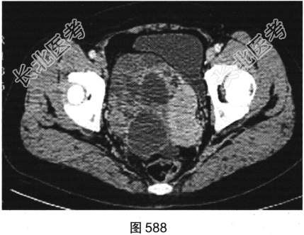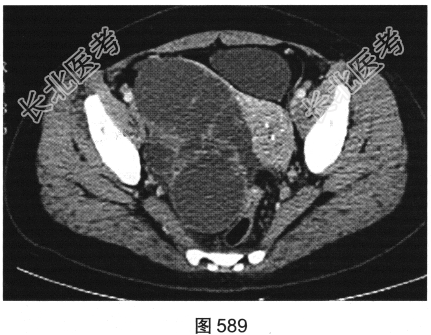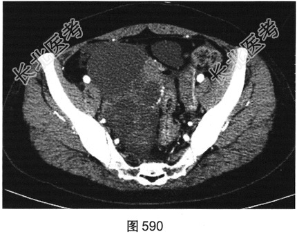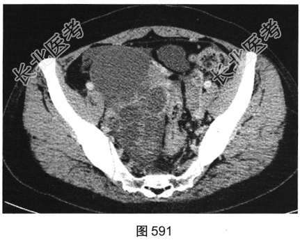 - 多项选择题2.[提示]患者盆腔CT表现见图590、图591。根据以上两幅盆腔CT图像,可以看到哪些阳性表现( )