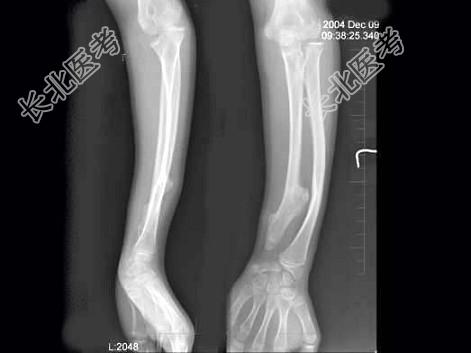 - 单项选择题女,12岁, 左前臂外翻畸形4年,摄片如图所示, 最可能的诊断是 ( )