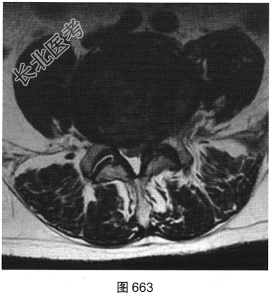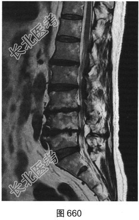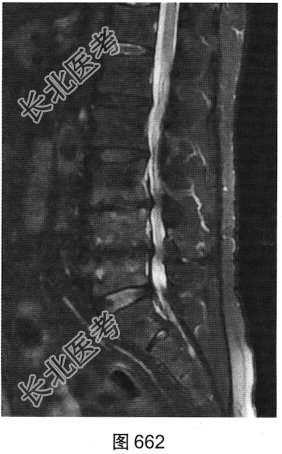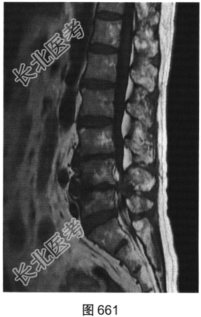 - 多项选择题3.[提示]患者行腰椎MRI检查,如图660~图663所示。患者MRI的T2压脂像上, 部分椎体上、下缘高信号提示( )