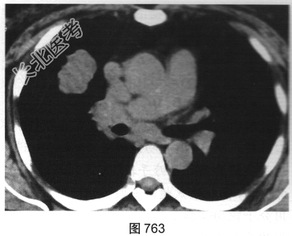 - 多项选择题2.[提示]患者行胸部CT检查,如图762、图763所示。胸部CT如图所示, 超声心动图显示心功能降低,冠状动脉CTA除显示原支架内轻度狭窄外, 未见其他异常。为明确病变性质,下一步应进行哪些检查( )