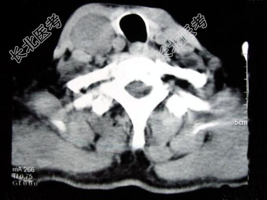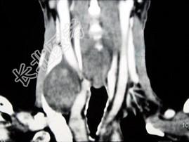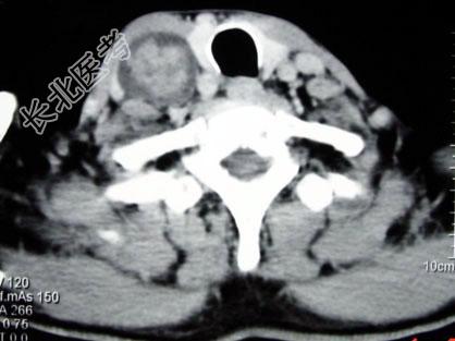 - 多项选择题男,70岁, 右侧颈部无痛性肿块3个月,CT扫描如图所示, 正确的描述或诊断是 ( )