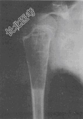 - 单项选择题男,11岁。2天前不慎碰伤右上臂, 疼痛伴活动受限。X线片如图。应首先考虑的诊断是