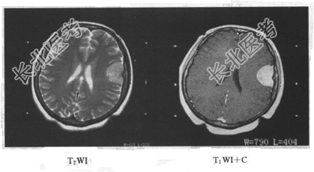 - 单项选择题患者,女, 34岁。头痛数年,头颅MRI平扫及增强扫描, 如下图所示最可能的诊断是