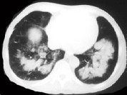 单项选择题女,34岁, 新月体肾炎患者,最近咳嗽咯血, 第一次行胸片检查考虑为双下肺感染,抗感染治疗后无明显好转, 症状加重,4天后复查并行CT检查如图, 应考虑为 ( )