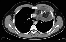 - 单项选择题20岁,男, 左胸痛伴压迫感,咳嗽1个月, 请结合CT,检查选出最可能的诊断 ( )