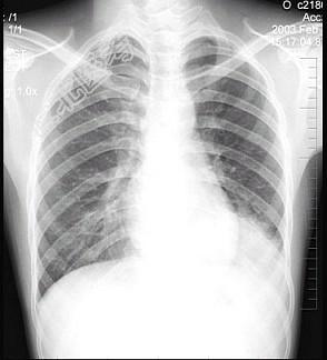 - 单项选择题男性患者,19岁, 咳嗽、发热1周,X线检查如图, 最可能的诊断是 ( )