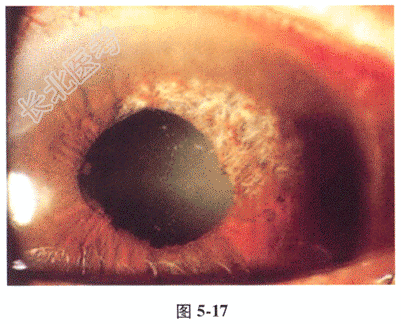 - [材料题] 患者女性,60岁,因“与家人争吵后出现头痛、右眼胀痛、视物不清1日”来诊。来诊后恶心、呕吐3次,呕吐物为胃内容物。既往高血压病史10年。查体:BP 170/80mmHg,HR 85次/min;神志清楚,结膜充血,角膜混浊,瞳孔直径5mm,对光反射迟钝(见图5-17);眼底检查未见视神经盘水肿、出血及渗出。实验室检查:Cr 400μmol/L,BUN 10mmol/L;外周血WBC 8×10⁹/L,Hb 105g/L,PLT 220×10¹²/L;尿蛋白(+),尿潜血(±)。