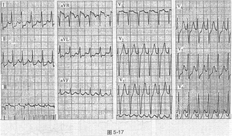 - 单项选择题患者男性,45岁, 反复发作心悸2年,每次发作突发突止, 持续数分钟至半小时不等,伴胸闷症状。心电图如图5-17所示, 应诊断为