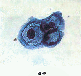 - [材料题] 患者女性,32岁,近日发现白带增多,性交后少量阴道出血,前来医院就诊。白带常规示阴道清洁度为Ⅲ度,未见滴虫、真菌。阴道B超示宫颈增大,呈不均质低回声。宫颈刮片结果:低度鳞状上皮内病变(LSIL),并可见如图40所示细胞。