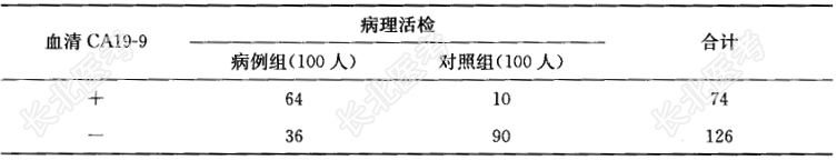 某实验室以病理活检为诊断胰腺癌的金标准,胰腺癌病例组与对照组各100例采用检测血清CA19-9的方法得到下列诊断结果。
