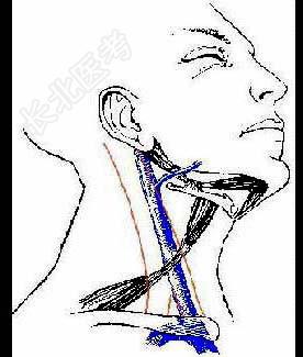 - 单项选择题如图,中路颈内静脉穿刺下述哪项是错误的 ( )