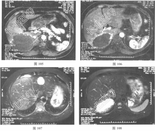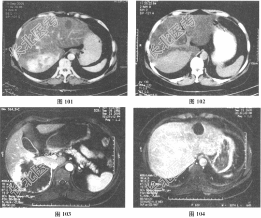 - 多项选择题2.[提示] 该患者增强CT和MRI检查提示肝脏有多发病变,其中右后叶的占位病灶约9.8cm×6.2cm×5cm大小; 结果见图101~图108。