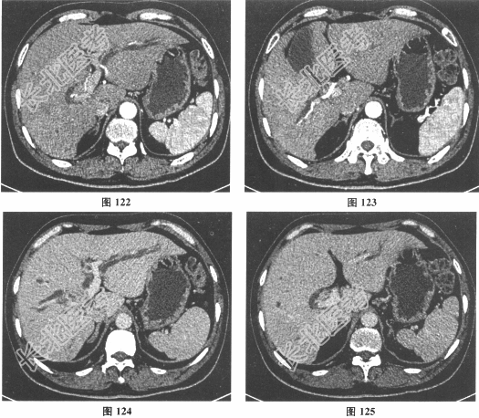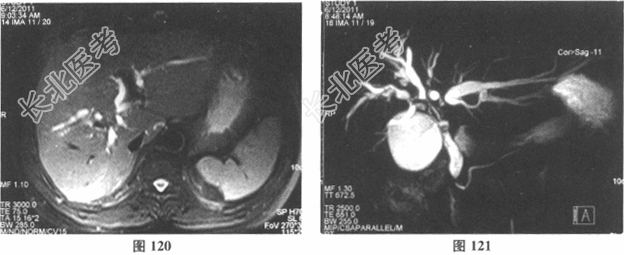 - [材料题] 患者男性,57岁,主诉"反复发热、右上腹痛2个月,巩膜皮肤黄染1周"入院。患者于2个月前无明显诱因突然出现发热、右上腹胀痛,当地医院就诊,给予抗炎对症治疗后缓解。之后发热、右上腹胀痛反复发作,外院行腹部CT检查示:"高位胆道梗阻,伴肝内胆管扩张"。1周前患者出现巩膜皮肤黄染。病来体重无明显变化,大便灰白,小便颜色加深。否认肝炎、结核病史。入院查CA19-9 1890U/ml,CEA2.56U/ml,AFP2.3ng/ml,CA12513.3U/ml,MRI和CT结果见图120~图125。