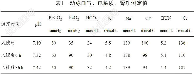 - [材料题] 患者男,70岁,因咳嗽20年,心悸、气促5年,加重伴意识不清1 d,以慢性支气管炎急性发作、阻塞性肺气肿、肺心病、肺性脑病收入院。入院后经用口面罩无创机械通气、抗感染、解痉祛痰药物治疗8 h后意识清楚。维持上述方案治疗48 h后,再次出现神经精神症状,调整机械通气参数治疗后,神经精神症状消失,动脉血气分析、电解质、肾功测定见表1。